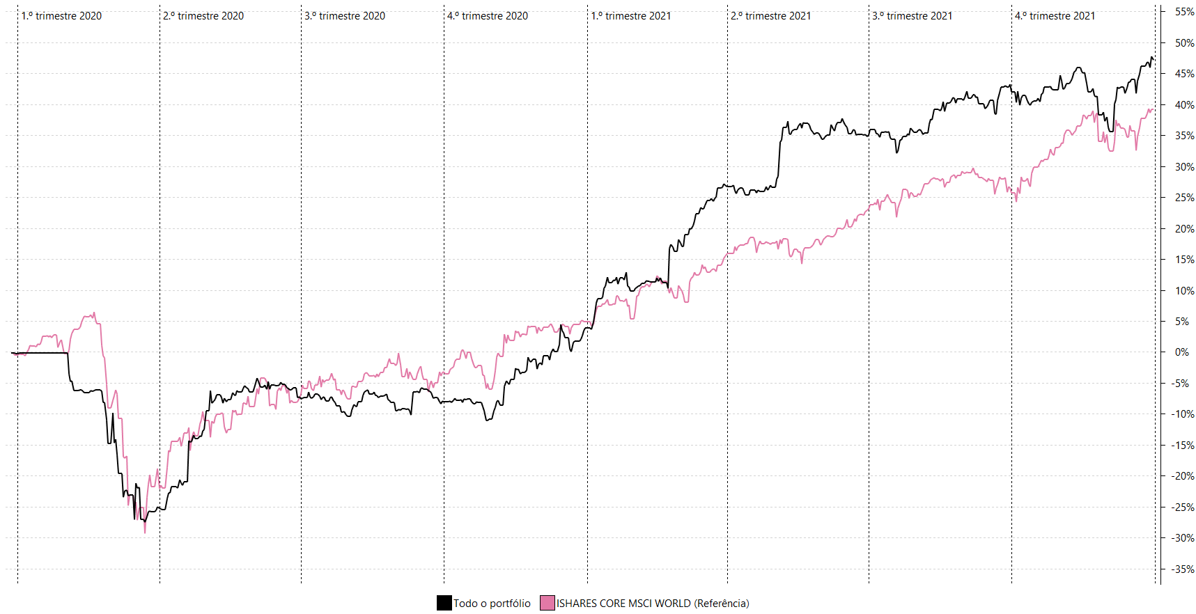 O portefólio da MyStockIdeas (MY) apresentou um desempenho acima do mercado, registando uma valorização de 48.6%, entre 31/12/2019 e 31/12/2021 (data em que o serviço foi suspenso – ver “Quem somos”). O índice global MSCI World apresenta um desempenho de 39.6% no mesmo período.
